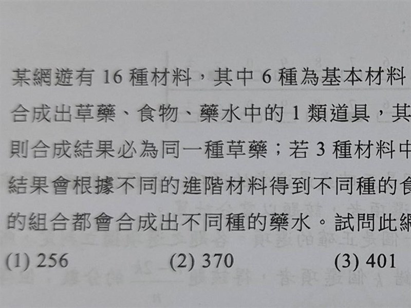 數學A第4題敘述網路遊戲常見的合成材料問題,要考生判斷6種基本材料、10種進階材料,在一定的規則下,總共可以合成出多少種道具。