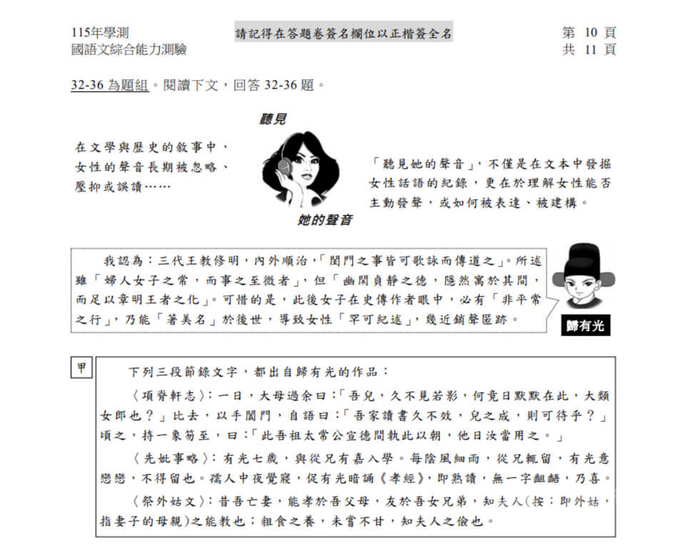 值得注意的是,占24分的混合題型(32到36題組),整整占了2個整頁,選用大量古今文本。以「聽見她的聲音」發端,「項脊軒志」及歸有光對「女性罕可紀述」的觀察,並引用現代文本「水面下」、「消失中的台灣阿嬤‧將女兒送養的阿母」等,探討社會觀念、習俗中被忽略的家族女性的聲音。