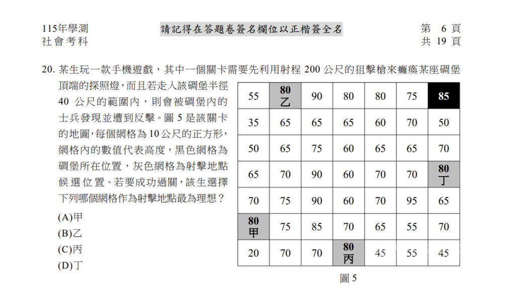 學測社會科有大量圖表,第20題出現一個模擬手機遊戲的網格圖,要求考生用射程200公尺的狙擊槍,癱瘓某碉堡頂端的探照燈,必須從圖中甲、乙、丙、丁4個點中,判斷何處是最理想的狙擊點。