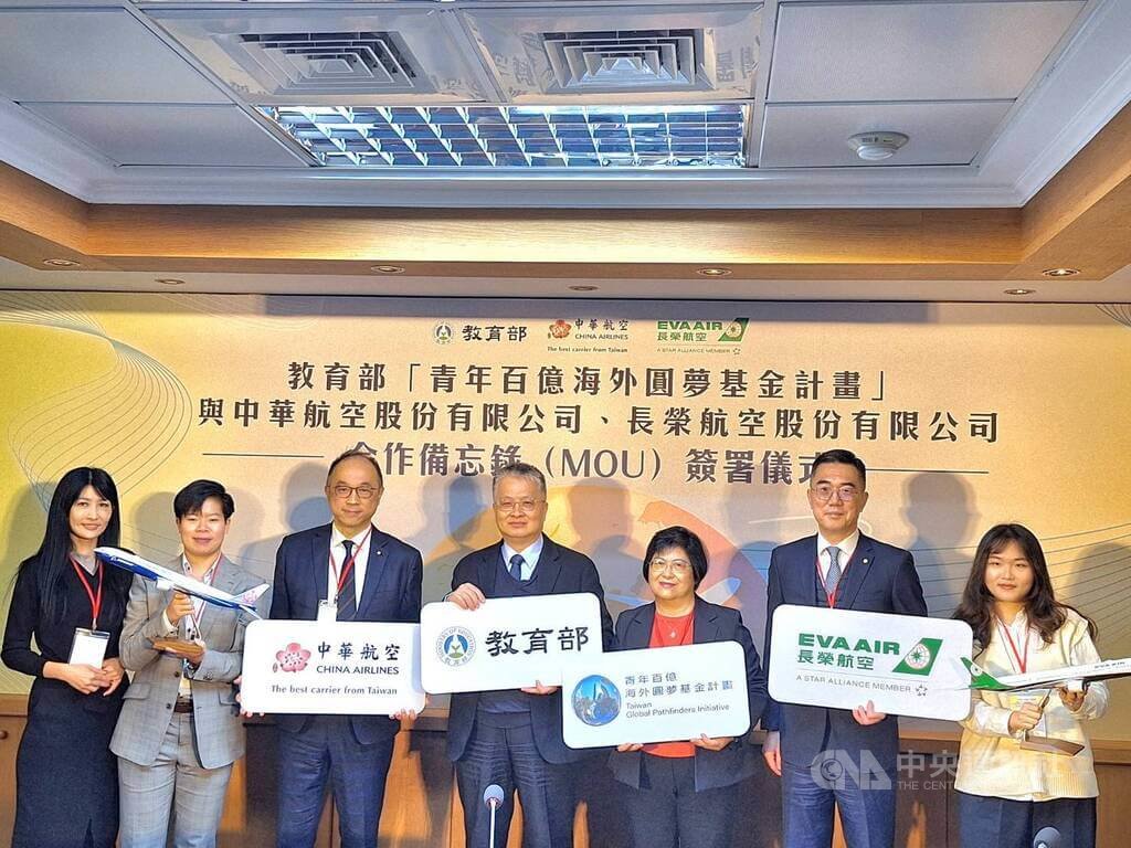 為深化青年國際參與,教育部今天舉行「青年百億海外圓夢基金計畫」合作備忘錄簽署儀式,由教育部青年發展署署長陳雪玉、中華航空台北分公司總經理馮震宇、長榮航空客運營業本部副總經理王振興代表簽署合作備忘錄。