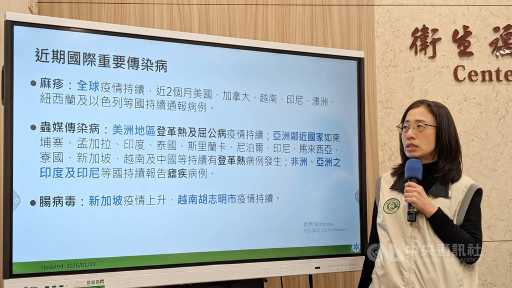 瘧疾部分,李佳琳表示,仍是當前全球重要公共衛生問題,除非洲外,亞洲的印度及印尼等國亦持續報告病例,民眾如規劃前往疫情發生地區,務必提前至少一個月至旅遊醫學門診諮詢評估用藥的需要,並依醫囑完整服藥。