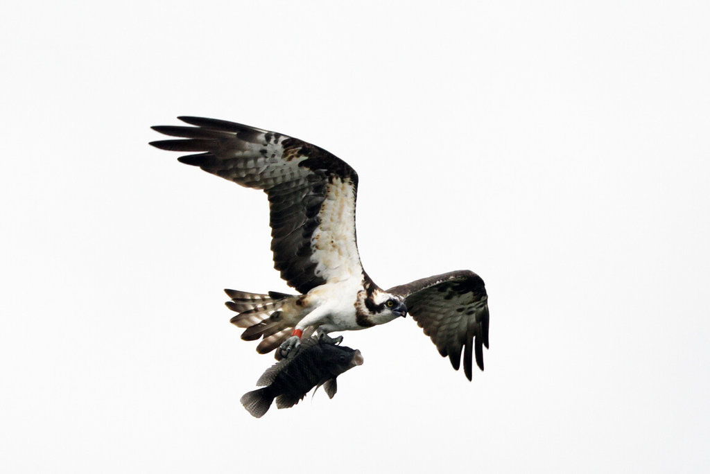 台東林姓鳥友今天告訴媒體,日前在知本魚塭拍到1隻魚鷹,利爪上掛著一尾大魚,矯健升空,他仔細檢視照片時發現牠的右腳配掛著編號B01橘色腳環,經野灣野生動物保育協會確認,這隻魚鷹是協會於去年4月間在同地點繫放。