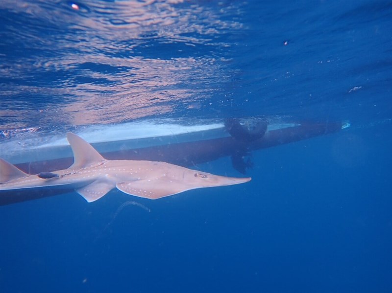 水試所今天發布新聞稿,為掌握台灣特有軟骨魚類「無斑龍紋鱝」(Rhynchobatus immaculatus)的生態資訊,2024至2025年間在澎湖及雲林外海,成功為5尾個體裝設電子衛星標識籤並放流追蹤。