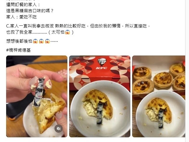 有民眾在社群平台發文表示,在肯德基高雄楠梓店購買蛋撻,因為要吃的時候已經冷掉,原本打算微波加熱,後來發現蛋撻內餡有1顆電池,文中並附上照片。