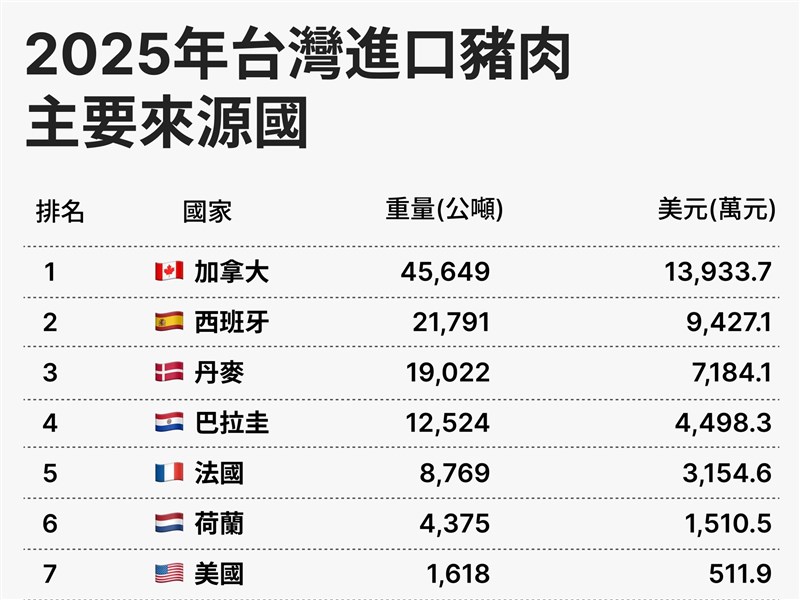 農業部統計,113年美豬進口占總進口量7.9%,排序第4,僅占國人豬肉消費量未及1%,114年占比降至6.7%,排序降為第6。