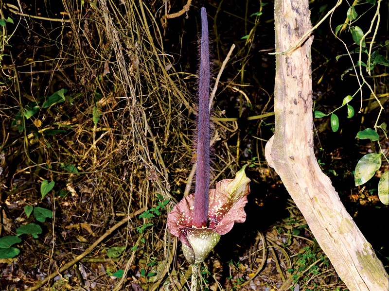 (中央社記者蔡孟妤高雄18日電)「雷公槍」又名密毛魔芋,是台灣特有植物。壽山國家自然公園內有密毛魔芋與台灣魔芋,自管處近年曾進行調查,結果不如預期,僅3個樣區調查到魔芋植株,決定今年起重新展開更長時間的調查。
