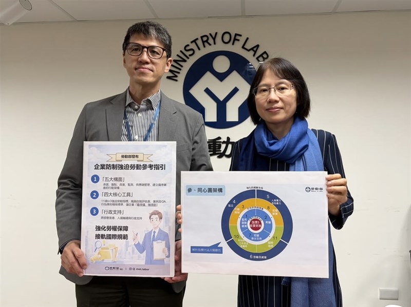 (中央社記者吳欣紜台北24日電)台灣在供應鏈角色越重要,人權保障也更受國際關注。勞動部今天發布「企業防制強迫勞動指引」,以同心圓概念說明11項指標內涵,也設計企業行動方案,盼協助企業防制強迫勞動。