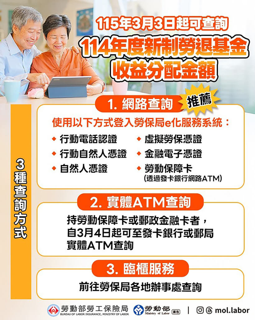 另外,因收益分配資料傳輸至實體ATM需作業時間,因此明天起才可利用土銀、玉山、台新、台北富邦及第一銀行的勞動保障卡或郵政金融卡(須先至郵局簽署勞保局資料查詢服務同意書)至發卡銀行或郵局實體ATM查詢。(編輯:李亨山)1150303