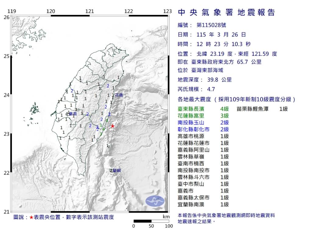 (中央社台北26日電)根據中央氣象署最新資訊,今天中午12時23分發生芮氏規模4.7地震,地震深度39.8公里,震央位於台東縣政府東北方65.7公里(位於台灣東部海域),最大震度台東縣4級。(編輯:管中維)1150326