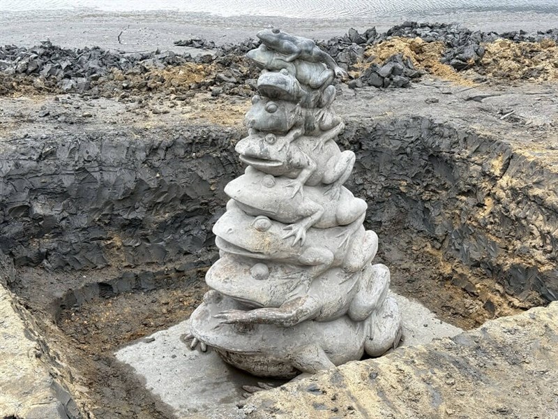 (中央社記者蕭博陽南投縣27日電)日月潭蓄水率目前約6成、相較滿水位降逾6公尺,位於大竹湖及伊達邵間的水蛙頭步道潭邊露出大面積淤泥,台電公司近日挖除「九蛙疊像」旁乾泥,並為九蛙洗澡,以便遊客欣賞。