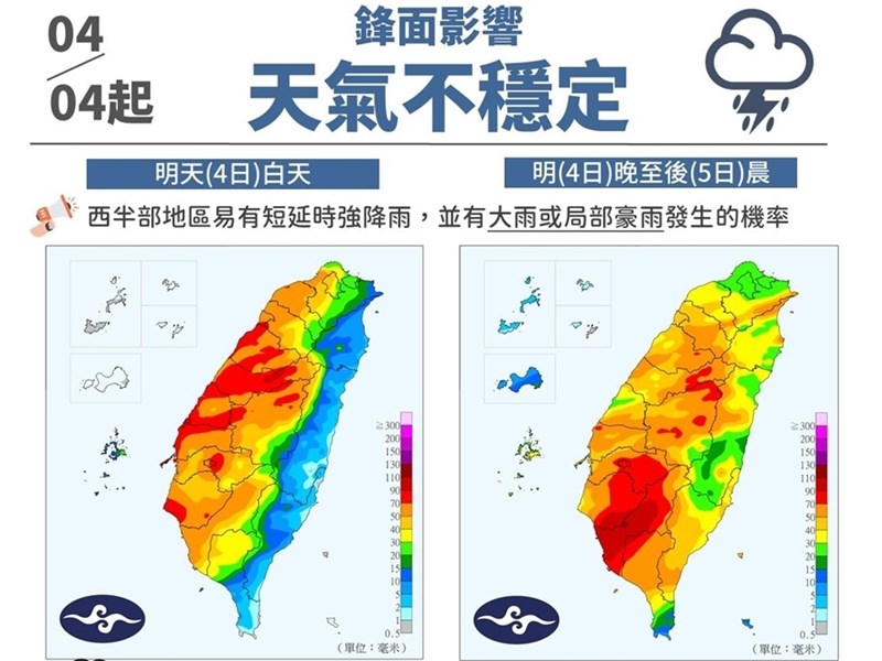氣象署預報員張承傳向中央社記者表示,明天起到5日清晨,受到鋒面影響,北部降雨明顯,西半部有雷雨,北部留意短延時強降雨,東半部也有局部陣雨或雷雨。