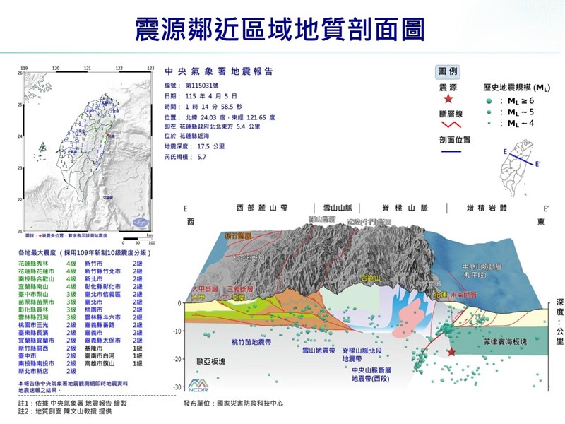 花蓮規模5.7地震115年最大 氣象署:獨立事件、板塊碰撞所致