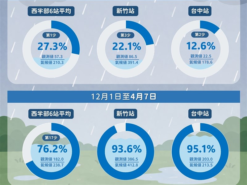 氣象署今天在臉書專頁「報氣候-中央氣象署」表示,上述統計期間,再加計至今年3月底,西半部6站的平均累積雨量約57.3毫米,仍為有紀錄以來最少,僅約氣候值(210.3毫米)的2成7。