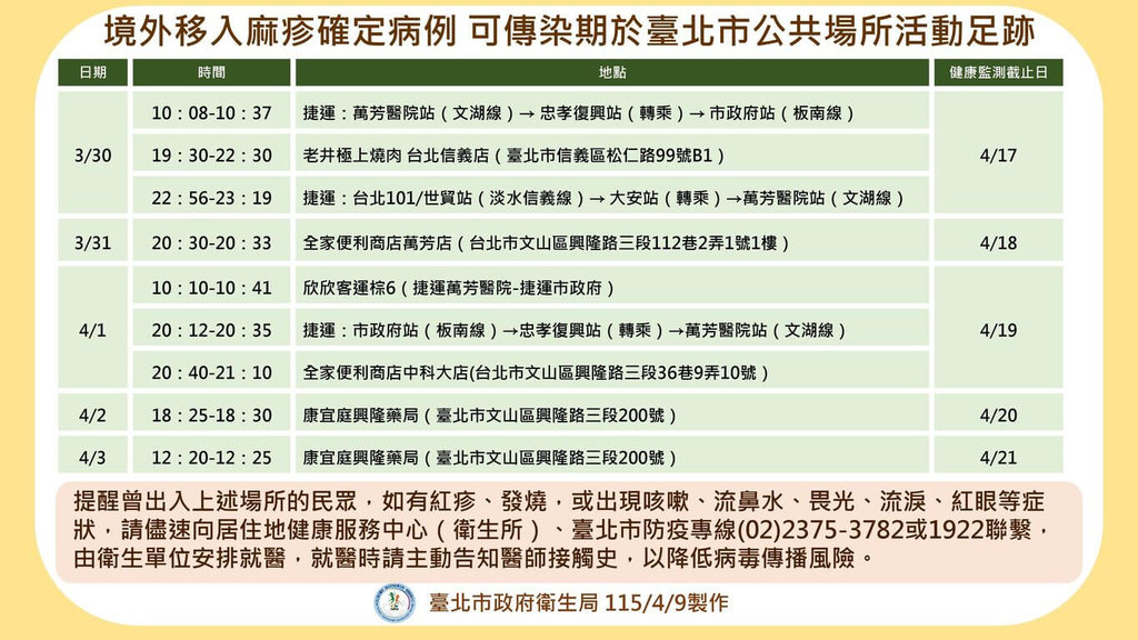 - 北市增1例麻疹境外移入 足跡及捷運文湖、板南線等2026/04/10 17:21