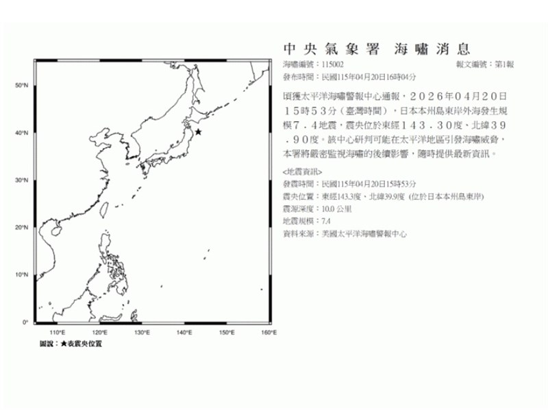 (中央社記者張雄風台北20日電)中央氣象署今天下午4時4分發布海嘯消息,日本本州島東岸外海發生規模7.4地震,太平洋海嘯警報中心研判可能在太平洋地區引發海嘯威脅。氣象署將嚴密監視後續影響。