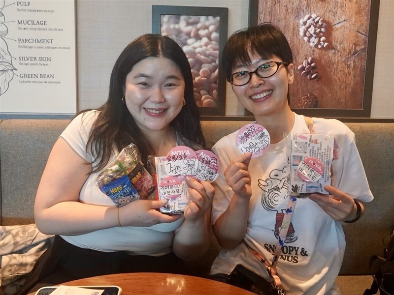 最驚喜的是,兩人此行還特地準備30包要發送給台灣人的零食小禮物,裡頭的徽章除了有中華民國國旗,上面還特地用韓文寫上「可愛的台灣人」,讓台灣人前往韓國旅遊時,一眼就能被辨認出來自台灣。