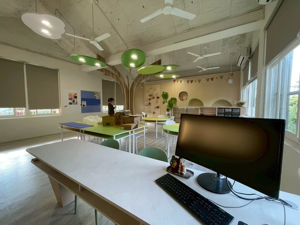 台南市新市國中將57年舊校舍改造成高質感的「異想教室」。設計團隊透過打開舊校舍斜屋頂,建立挑高舒適空間,並大量採用森林、綠意與木作元素,搭配柔和燈光,淡化傳統教室的冰冷標籤。