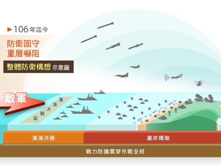 國防部指出,依「防衛固守、重層嚇阻」軍事戰略指導,發展「戰力防護、濱海決勝、灘岸殲敵」整體防衛構想,並善用台海天塹及地緣優勢,發揮「創新╱不對稱」的作戰思維,綜合三軍戰力掌握戰場主動,給予敵人致命打擊,達成「破敵奪台任務失敗」的作戰目標。