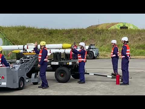 空軍現場介紹,今天執行IDF結束作戰任務後,落地進行防空外型掛載,包含在兩翼翼尖各掛載1枚AIM-9P4響尾蛇飛彈,以及在機腹掛載1枚天劍二型中程空對空飛彈,並將機砲滿載;基於現場安全考量,加油作業採模擬方式呈現。