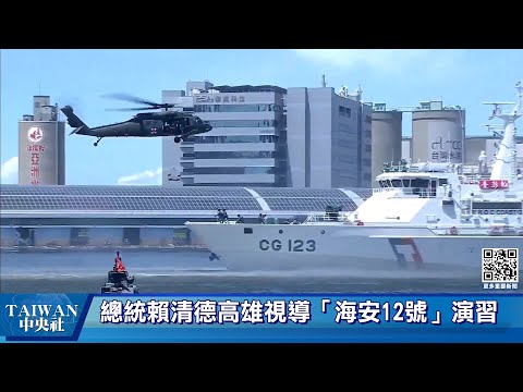賴總統在海洋委員會主委管碧玲與多名民意代表陪同下,上午到高雄港視導演習並頒發加菜金。這次操演科目有「海上攔截圍捕」、「吊掛救援」及「海空分列式」等3項,演習過程震撼人心,展現跨機關面對海域突發事件時的聯防應變量能。