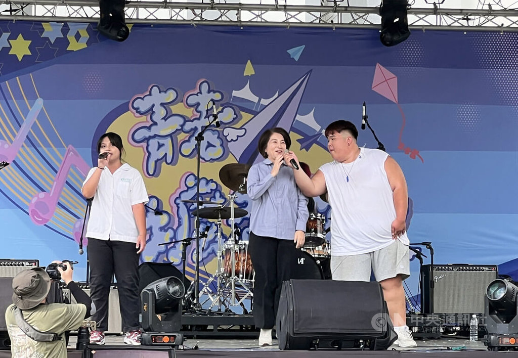 2025屏東青春祭15日起在屏東公園登場,縣長周春米(中)登台與學生一起演出青春祭主題曲「青春。夢」。中央社記者李卉婷攝  114年8月15日