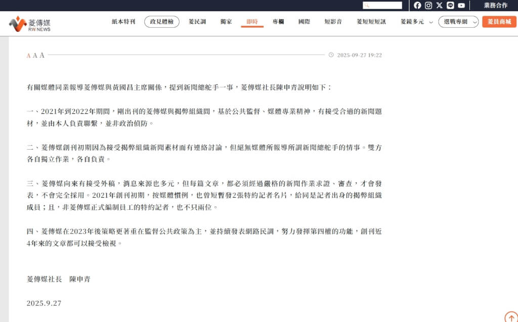 對此,「菱傳媒」在電話中向中央社記者表明「不會回應目前公司的決策」,社長陳申青則至截稿前未接電話。(編輯:林恕暉、陳清芳)1140930