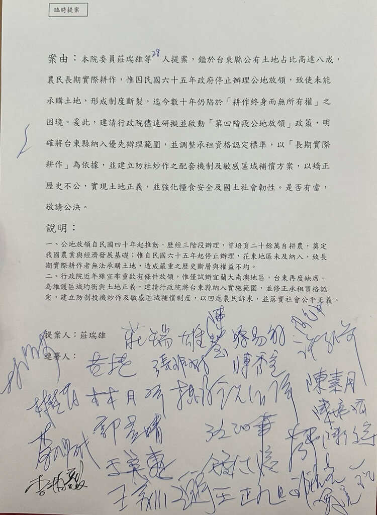 - 莊瑞雄和陳瑩提案推公地放領 盼台東列優先區域2025/10/07 16:44