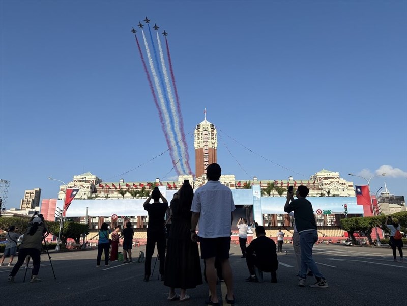 - 國慶空中全兵力操演 雷虎小組噴彩煙飛越總統府【圖輯】2025/10/08 08:53