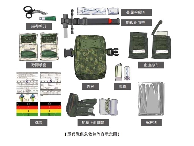 此外,國軍也參酌美軍急救包標準規格,採購國軍單兵戰傷急救包,全面提升國軍戰傷救護能量,現階段全軍常備部隊每個官兵已獲撥1組,於各戰(演)訓時機佩掛使用;未來持續籌購後備部隊所需數量,以增加戰時官兵存活率。