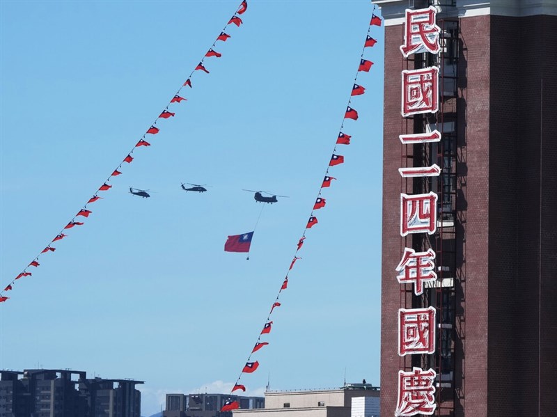 (中央社記者楊堯茹台北10日電)114年國慶大會今天在彰化縣大村國小合唱團的國歌聲中,揭開序幕。同時間,契努克運兵直升機吊掛巨幅國旗飛越總統府前廣場上空,慶祝中華民國114年國慶。