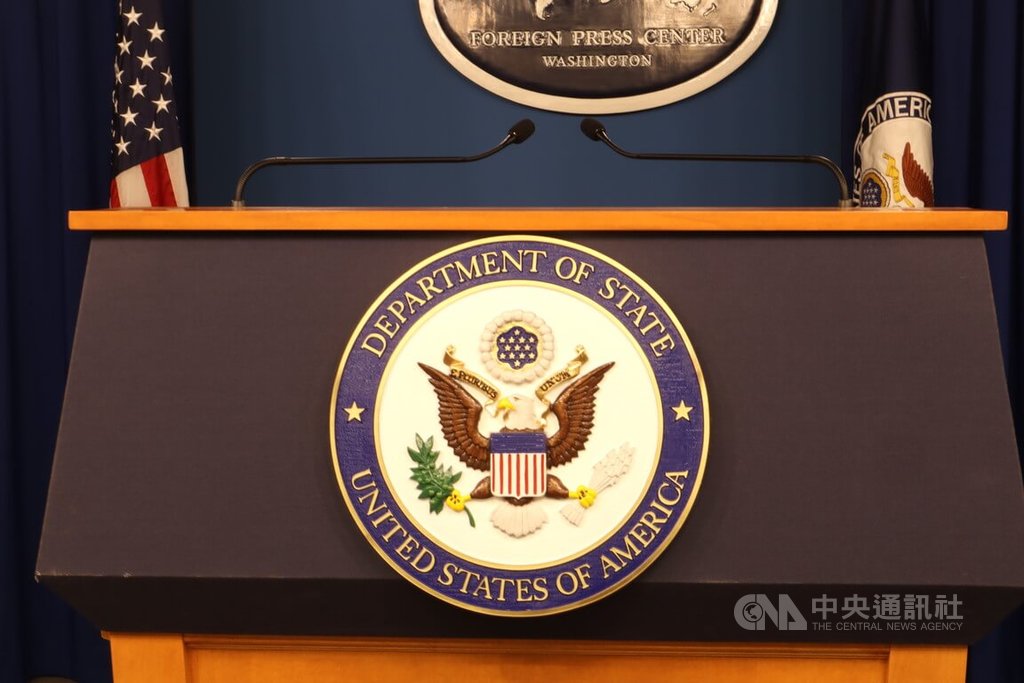 美國國務院12日表示,美國的首要任務是維護台海和平穩定,美方將依法確保台灣擁有與其面臨的威脅相稱的自衛能力。圖為美國國務院外籍記者中心講台。攝於114年7月11日 中央社記者鍾佑貞華盛頓 114年10月13日