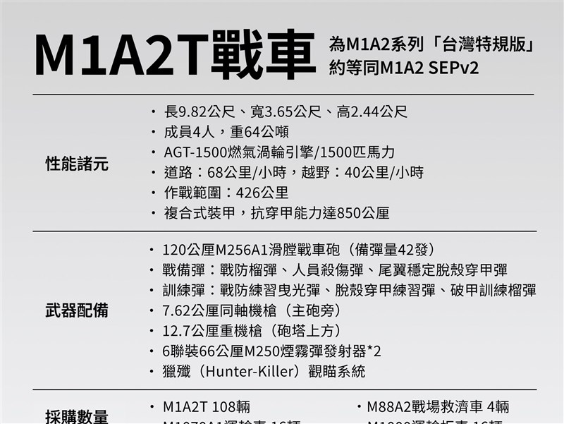 台灣對美採購108輛被稱為地表最強戰車的M1A2T戰車,M1A2T擁有數位化內裝及遙控槍塔,亦配備「車際間資訊互聯系統(IVIS)」,能即時接收或分送戰場資訊,大幅提升整體作戰效能。M1A2T的120公厘口徑滑膛砲,有效射程內可貫穿850公厘均質鋼板。M1A2T也可搭配獵殲系統(Hunter-Killer)。