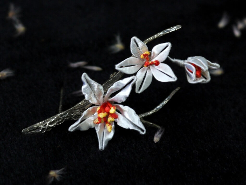 桐花銀別針是以縲縈、金屬線、特殊紙片、與絲線為材料,透過細心精巧的手工將絲線仔細纏於金屬絲與紙板上,再曲折造型,形塑花朵的層次感。桐花又被譽為五月雪,花芯中的粉紅色也讓人感受到女性的柔美,是客家文化的代表之一。