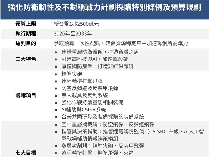 顧立雄說明,「強化防衛韌性及不對稱戰力特別預算」預算上限為1兆2500億元(暫匡),編列目的是爭取預算一次配賦,確保資源穩定集中、加速籌獲所需戰力,籌購項目包括精準火砲、遠程精準打擊飛彈、防空反彈道及反裝甲飛彈、無人載具及反制系統、強化作戰持續量能相關裝備、AI輔助與C5ISR系統、台美共同研發及裝備採購的裝備系統。