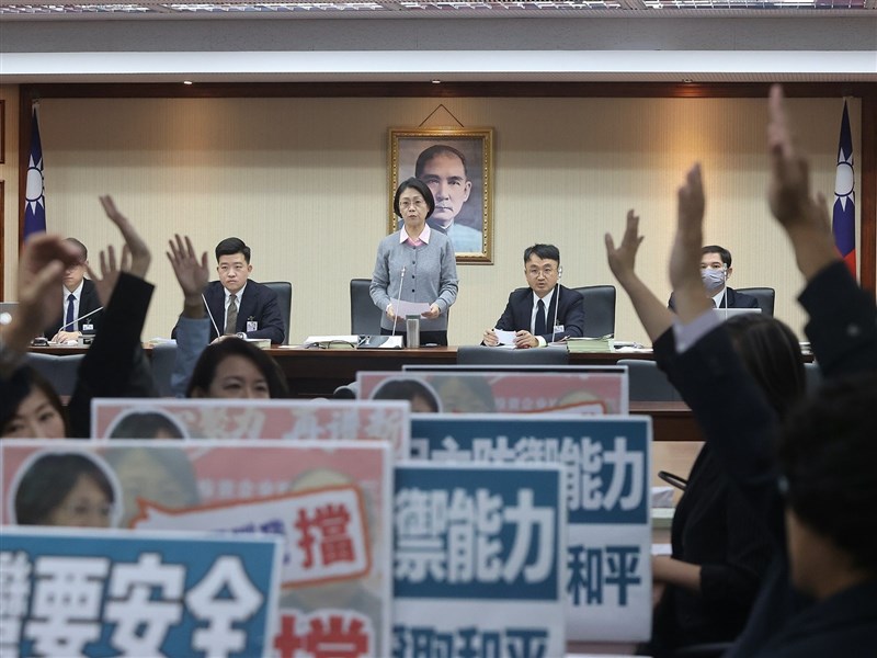 (中央社記者王揚宇台北23日電)立法院程序委員會今天開會,朝野激烈口角,在藍白立委聯手下,再度封殺行政院所提1.25兆國防特別條例及財劃法草案排入26日立法院會的報告事項議程,無法交付相關委員會審查。