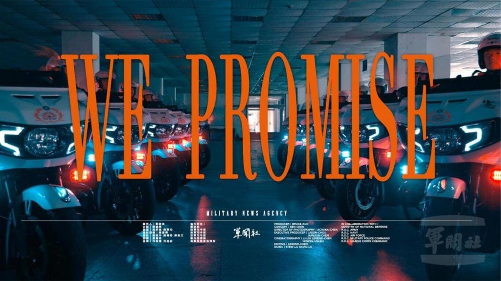 (中央社記者吳書緯台北1日電)國防部軍事新聞通訊社今天發布元旦形象影片「We Promise」,以電子嘻哈與管弦樂交織出的創新音樂風格與寫實鏡頭,刻劃國軍官兵「承諾始終如一」的國防力量,展現守護家園的堅定承諾。
