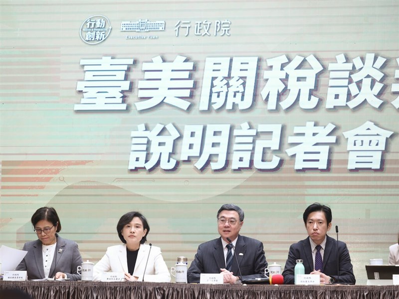 台美關稅談判在美東時間15日結束總結會議,雙方達成台灣對等關稅調降為15%且不疊加原有的最惠國待遇稅率(MFN)、半導體及半導體衍生品等232關稅取得最優惠待遇,以及台灣企業自主投資2500億美元加上政府以信用保證方式支持金融機構提供最高2500億美元的企業授信額度等共識。卓榮泰、行政院副院長鄭麗君等人今天出席「台美關稅談判說明記者會」 。
