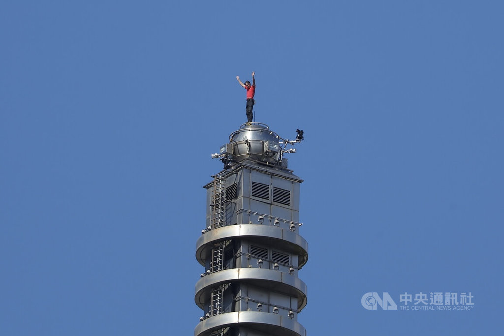 美國自由攀岩好手霍諾德挑戰徒手攀爬台北101大樓,今天上午9時登場,台北天候良好,場外聚集大批媒體及民眾,10時許霍諾德已攀登超過60層樓,10時43分成功登上508公尺高大樓頂端後,揮手向群眾及鏡頭致意。(編輯:林淑媛)1150125