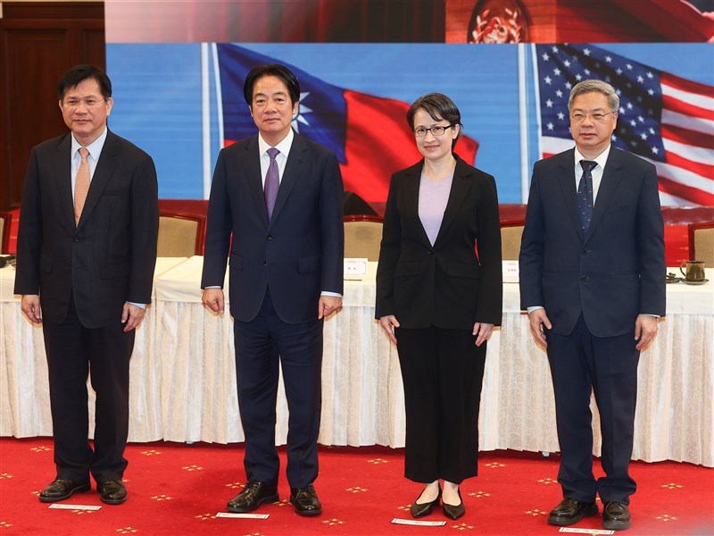 總統賴清德(左2)3日在總統府主持「台美經濟繁榮夥伴對話」記者會,副總統蕭美琴(右2)、外交部長林佳龍(左)、經濟部長龔明鑫(右)出席與會。中央社記者謝佳璋攝 115年2月3日