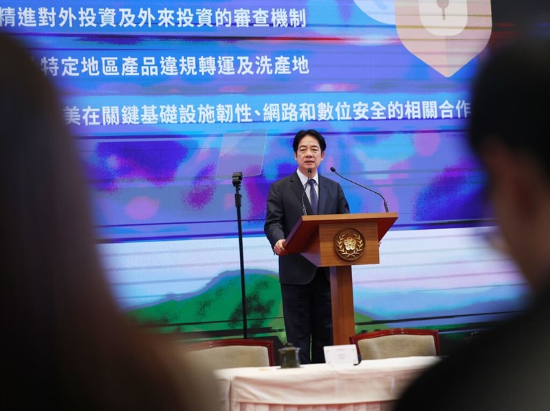 賴總統上午在副總統蕭美琴、行政院長卓榮泰、總統府秘書長潘孟安等人陪同下,舉行「因應台美簽署貿易協議新局」國安高層會議會後記者會。