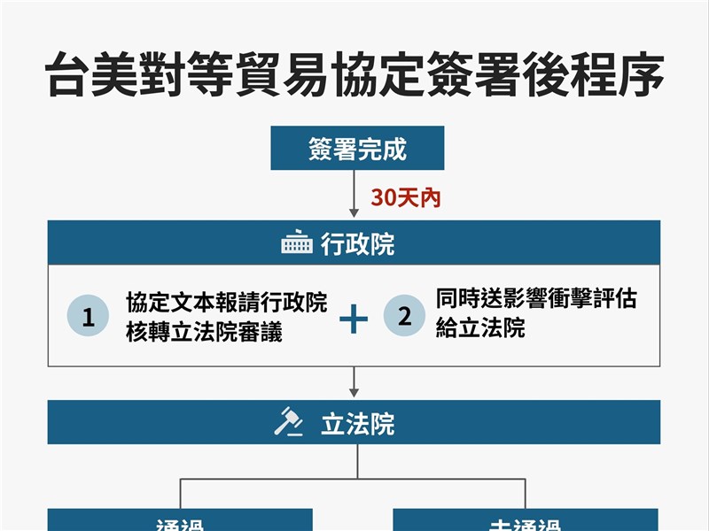 如今台美再簽署台美對等貿易協定(ART)完成整體對等關稅談判,行政院已說明,將併同1月簽署的台美投資MOU一同送立法院審議。根據條約締結法第8條,條約案經簽署後,經貿辦應於30天內將ART報請行政院核轉立法院審議。根據行政院副院長鄭麗君先前說法,行政院同時也會送衝擊影響評估給國會。