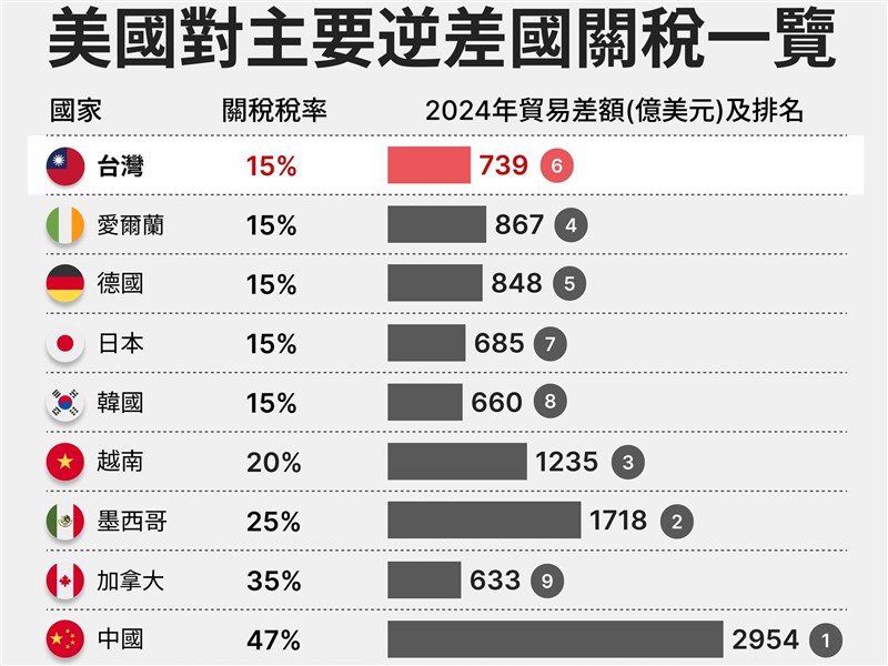 美國經數月談判後,對主要貿易夥伴徵收關稅的稅率、項目與緣由各不相同,條件也不一樣。