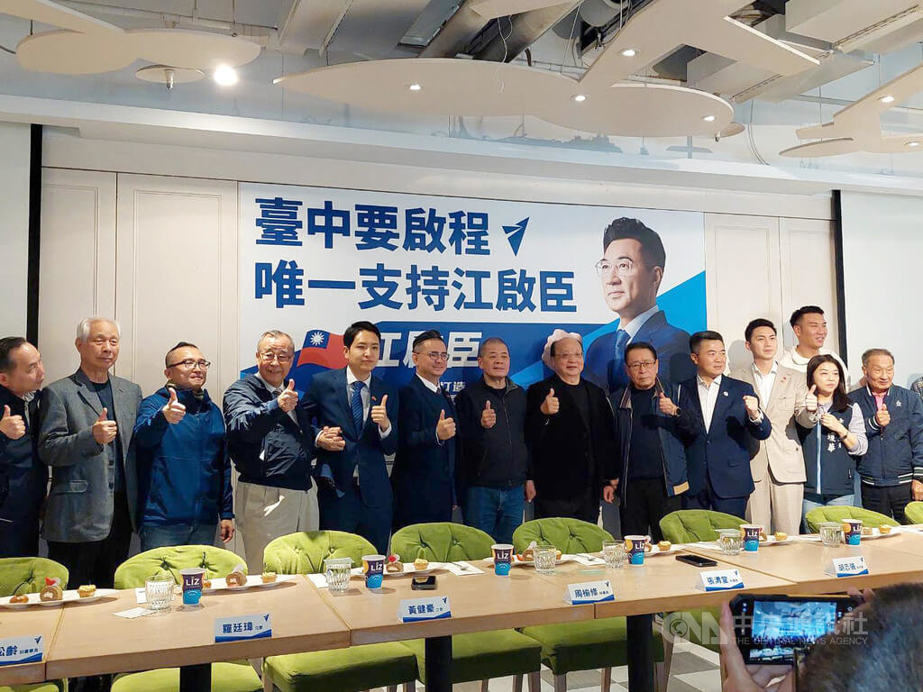 前台中市長胡志強、前台中縣長廖了以與前台中縣市議長林敏霖、張清堂、林士昌,以及國民黨立委顏寬恒、羅廷瑋、廖偉翔、黃健豪與台灣民眾黨秘書長周榆修等人,今天一同出面力挺江啟臣參選市長。