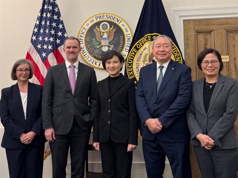 台灣及美國在美東時間2月12日簽署台美對等貿易協定。左起為美國在台協會華盛頓總部執行理事藍鶯、美國貿易代表葛里爾、行政院副院長鄭麗君、駐美代表俞大㵢、行政院政務委員楊珍妮。(圖取自facebook.com/love.lichiun)