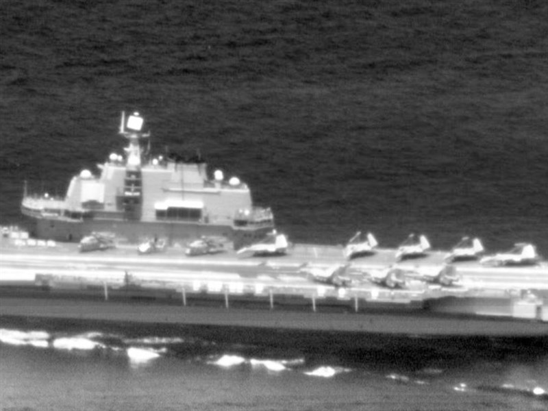 (中央社記者吳書緯台北20日電)國防部今天下午指出,中共遼寧號航空母艦今天航經台灣海峽,國軍綿密監控。根據國防部發布的監控照片,可清晰看到遼寧艦飛行甲板上的艦載戰鬥機、直升機。