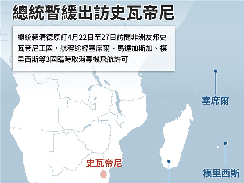 賴總統原定22日直飛出訪非洲友邦史瓦帝尼,因島國塞席爾、模里西斯與馬達加斯加無預警取消專機飛航許可,導致行程暫緩。