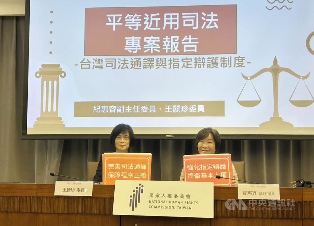 為因應「公民與政治權利國際公約」規範、了解台灣司法通譯現況,人權會副主委紀惠容、委員王麗珍調查逾1年,訪談外事警察、檢察官、法官、法律扶助基金會律師、特約通譯、書記官及公設辯護人,今天舉行「平等近用司法:台灣司法通譯及指定辯護制度」專案報告發表會,點出台灣司法通譯困境,並提出立專法等6項呼籲。