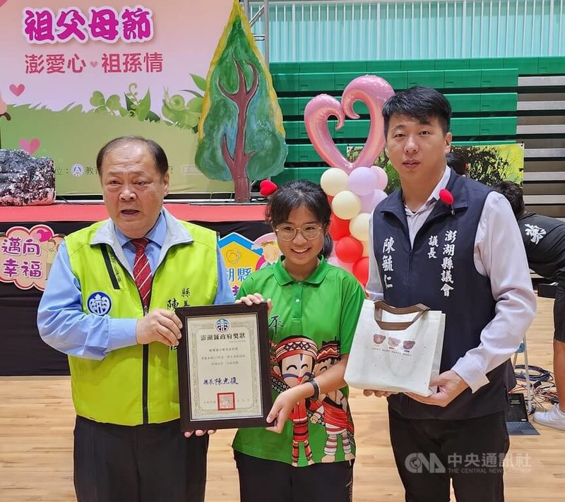 澎湖縣家庭教育中心今天在澎湖多功能體育館舉辦「澎愛心 祖孫情」祖父母節活動,吸引100對祖孫參與,澎湖縣長陳光復、議長陳毓仁、無黨籍議員蘇陳綉色、教育處長林長安等人也到場,同時表揚榮獲學生孝悌楷模翁采羽等10名國中小學生。