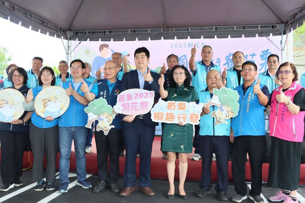苗栗縣政府文化觀光局今天舉辦「2025桐花祭-桐趣行尞苗栗」開幕活動,邱星崴、苗栗縣副縣長邱俐俐、苗栗縣文化觀光局長林彥甫、造橋鄉長徐連斌等人出席,並於現場進行祈福儀式,共為桐花祭活動揭幕。