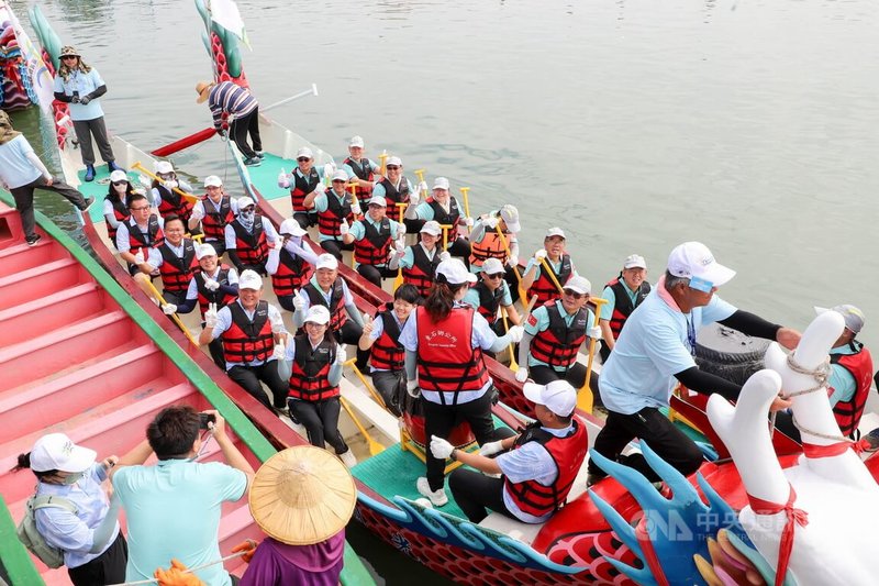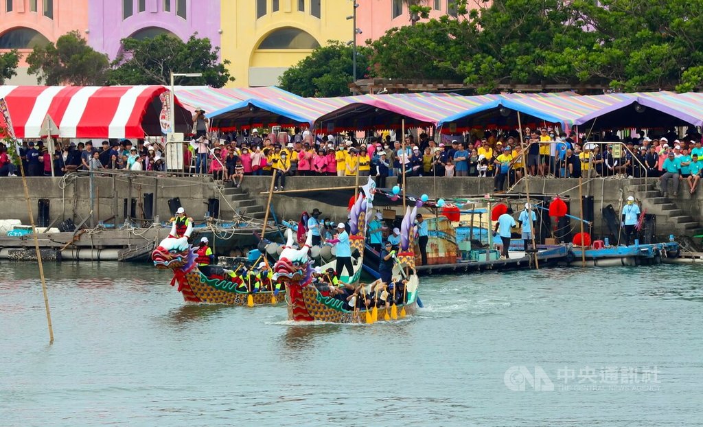 (中央社記者蔡智明嘉義縣31日電)嘉義縣端午龍舟競賽暨觀光行銷活動今天在東石漁人碼頭熱鬧登場,參賽48隻隊伍划破海水爭奪冠軍,吸引不少民眾到場觀賽,還可免費品嚐東石港先天宮提供的蚵仔粥。
